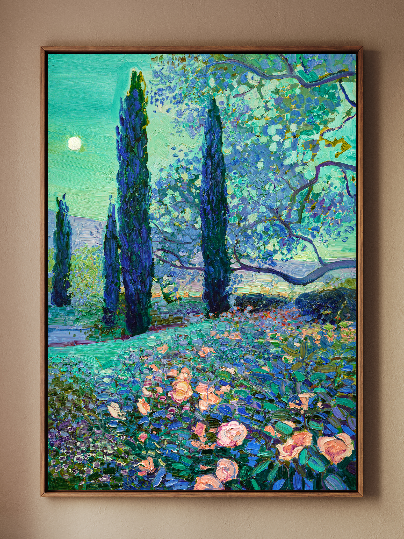 The paintings are created on museum-quality canvas, individually prepared by the artist in the studio.