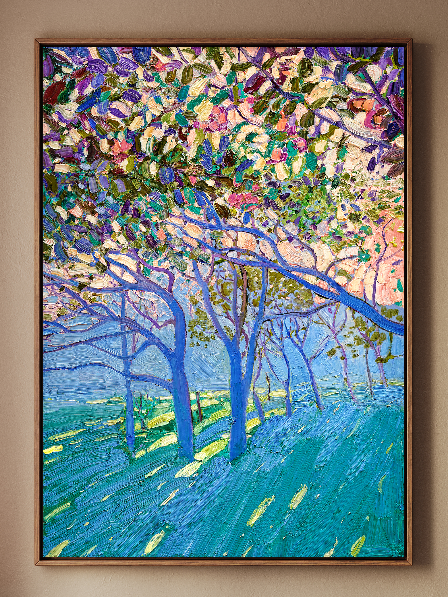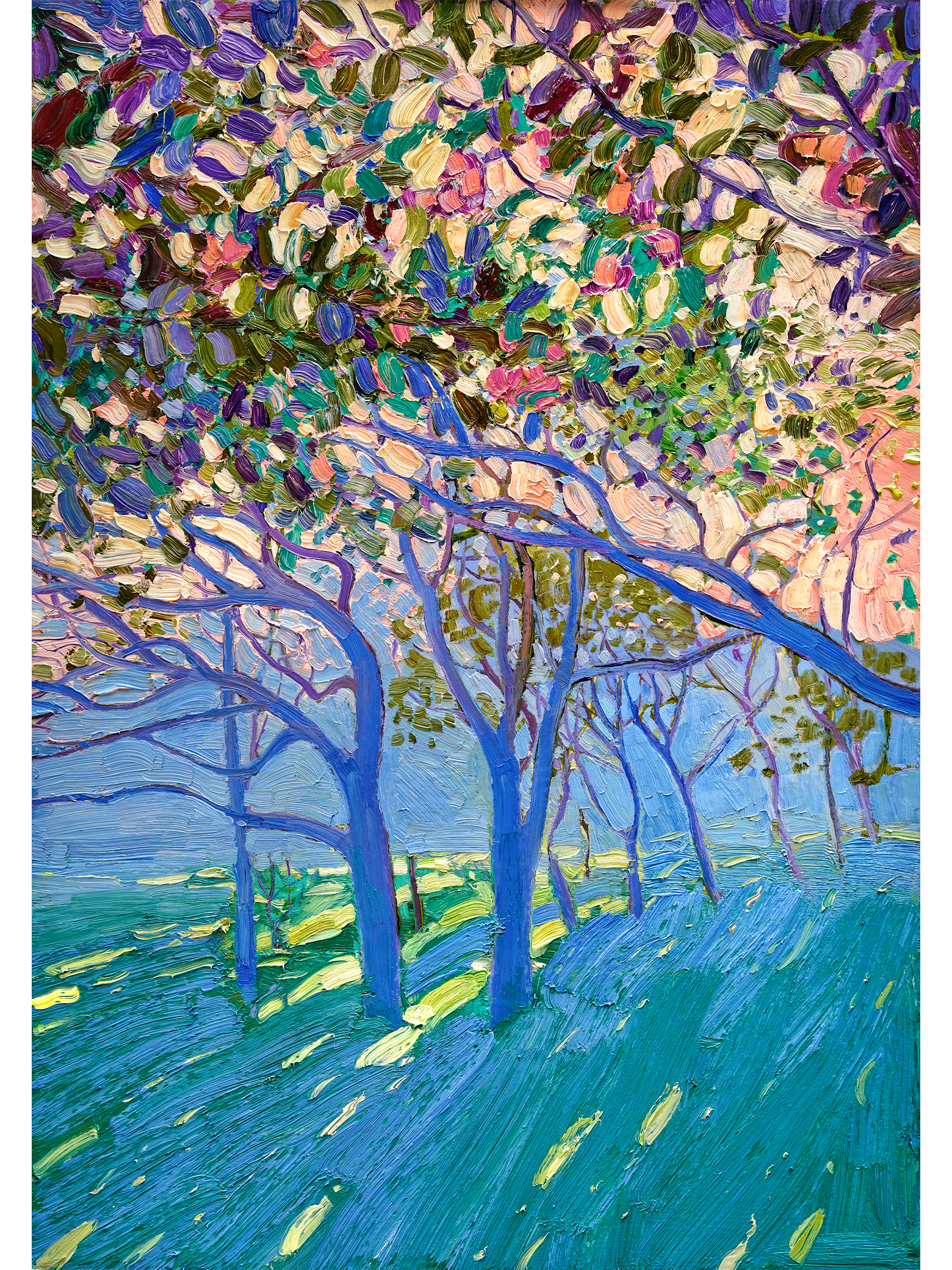 The paintings are created on museum-quality canvas, individually prepared by the artist in the studio.